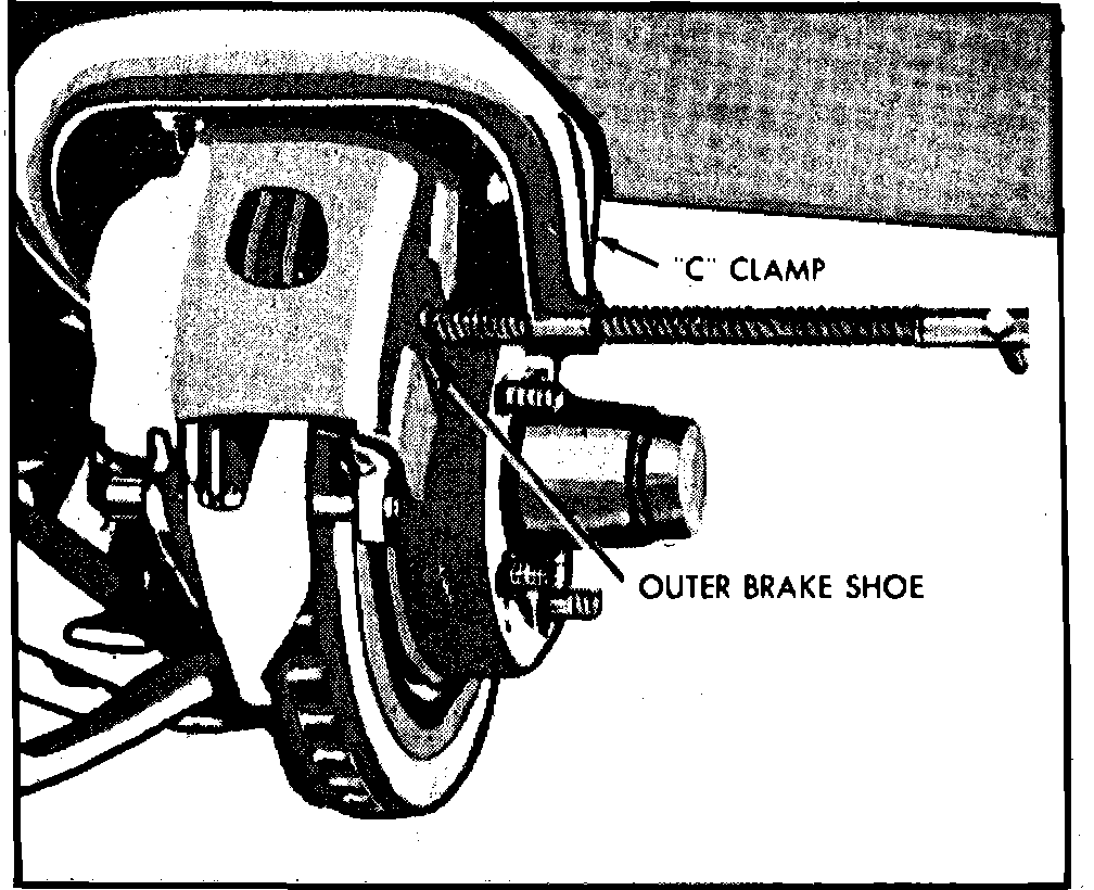 Fig. 2 Compressing piston & shoes with C-clamp:
