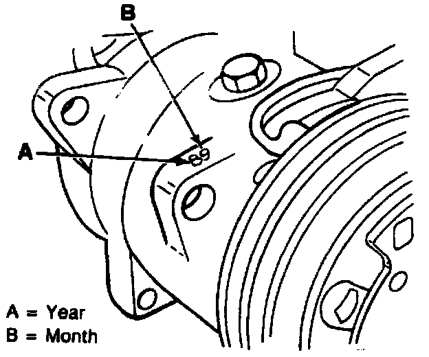 The Compressor can be identified by a label attached to the compressor body giving the part number, model, and manufacturer's name. The date code is stamped on the front left mounting ear viewed as facing the clutch. It will be either a two-digit number or a number-letter combination. The first number gives the year of manufacture. This is followed by one of the numbers 1 through 9, indicating the months January through September, October, November or December are indicated by an X, Y, or Z.
