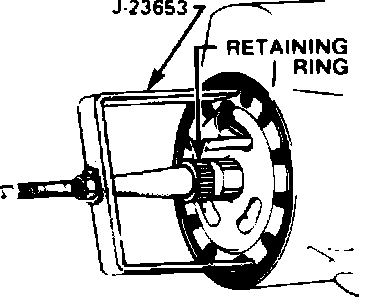 4. Using lock plate compressing tool No. J-23653, compress lock plate and pry retaining ring from groove on shaft, Fig. 6. Slowly release lock plate compressing tool, remove tool and lock plate from shaft end.