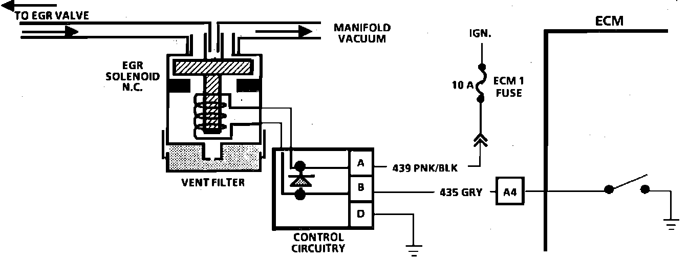 The EGR Valve is controlled by a normally closed solenoid. The ECM pulses the solenoid to turn "ON" and regulate the EGR. The ECM diagnoses the system using an internal EGR test procedure. The ECM control of the EGR valve is based on the following inputs: