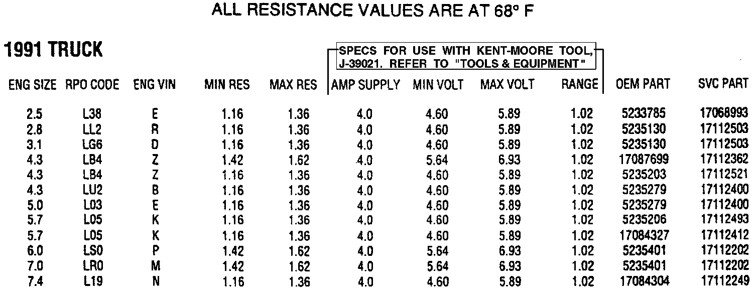 Injector Resistance, Application Chart & J-39021 Tester Values