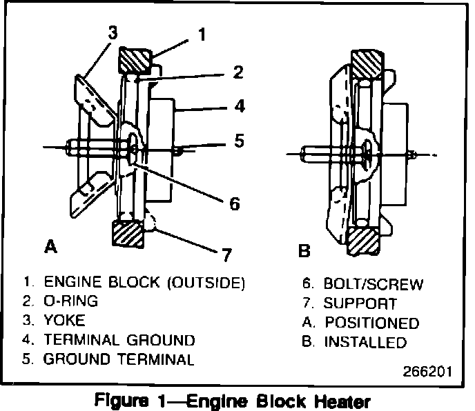 The block heater brass yoke may crack due to stress corrosion where it contacts the stainless steel crossbar. The yoke is stressed or cracked from over torquing the hold down screw (Figure 1, "6"). Corrosion in the stressed area is accelerated due to the dissimilar metals.