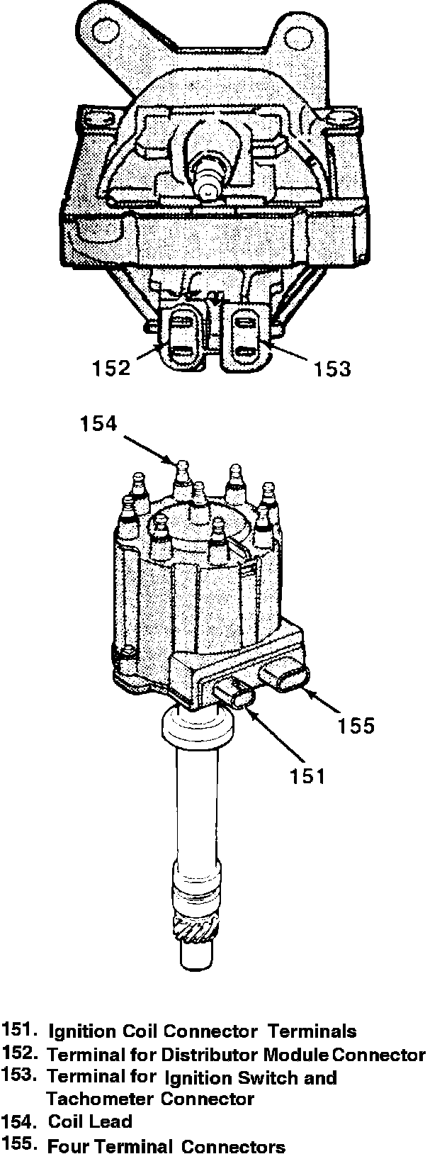 Never connect a wire directly between the Tach terminal of the distributor connector and ground as this will damage the electronic circuitry of the module. When using a timing light to adjust ignition timing, the connection should be made at the No. 1 spark plug. Forcing foreign objects through the boot at the No. 1 spark plug terminal will damage the boot and cause engine misfire.