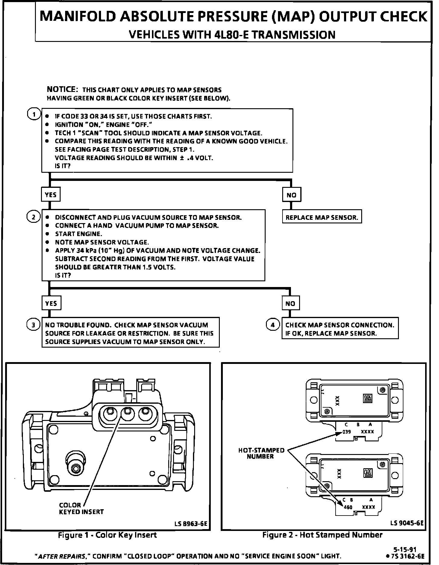 2. Applying 34 kPa (10" Hg) vacuum to the MAP sensor should cause the voltage to change. Subtract second reading from the first. Voltage value should be greater than 1.5 volts. Upon applying vacuum to the sensor, the change in voltage should be instantaneous. A slow voltage change indicated a faulty sensor.