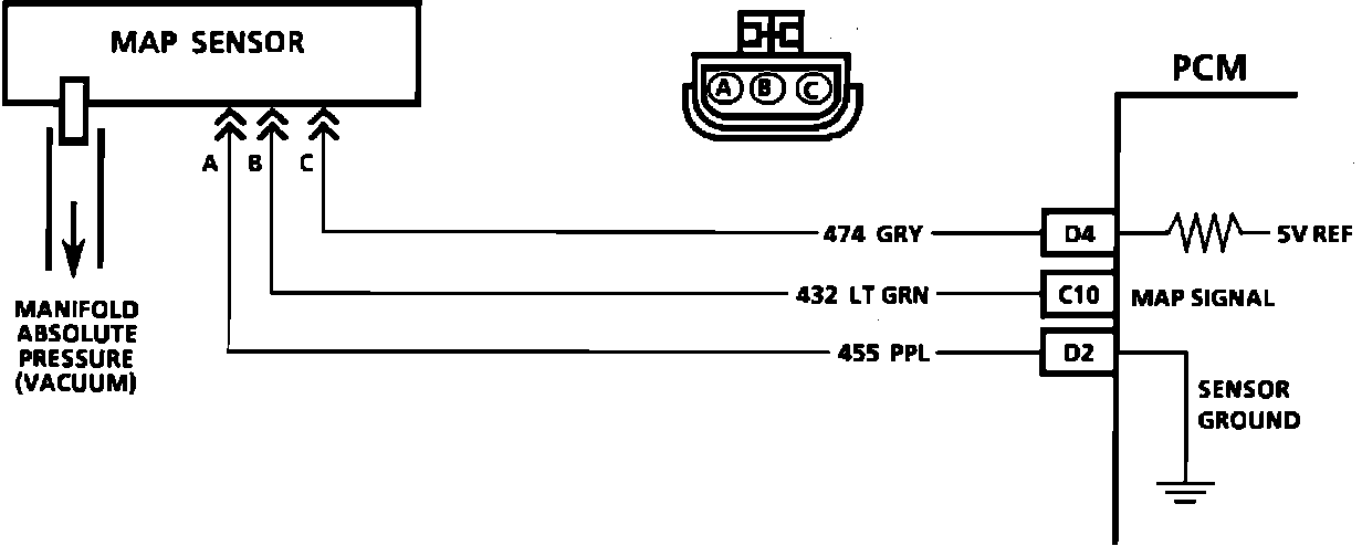 The Manifold Absolute Pressure (MAP) sensor measures the changes in the intake manifold pressure which result from engine load (intake manifold vacuum) and rpm changes; and converts these into a voltage output. The PCM sends a 5 volt reference voltage to the MAP sensor. As the manifold pressure changes, the output voltage of the sensor also changes. By monitoring the sensor output voltage, the PCM knows the manifold pressure. At lower pressure output voltage will be about 1 to 2 volts at idle. While at higher pressure or Wide Open Throttle (WOT) the output voltage will be about 4 to 4.8 volts. The MAP sensor is also used, under certain conditions, to measure barometric pressure, allowing the PCM to make adjustments for different altitudes. The PCM uses the MAP sensor to control fuel delivery and ignition timing.