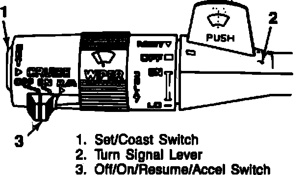 The mode control assembly, Fig. 1, consists of a 3 position slide-type switch and a set/coast switch button. To operate the system, the slide switch must be in on position and vehicle speed must be above 25 mph. The system is engaged at the desired speed by fully depressing, then releasing the set/coast button. Cruise speed can be increased from set position by accelerating vehicle to desired speed, then pressing and releasing button. In order to decrease speed, the set/coast button is held in the fully depressed position (disengaging system), then released when the desired speed is reached. The system can be disengaged at any time by depressing the brake or clutch pedal, or by moving the slide switch to off position.
