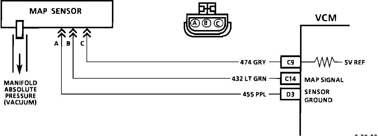 2. Applying 34 kPa (10" Hg) vacuum to the MAP sensor should cause the voltage to change. Subtract second reading from the first. Voltage value should be greater than 1.5 volts. Upon applying vacuum to the sensor, the change in voltage should be instantaneous. A slow voltage change indicated a faulty sensor.