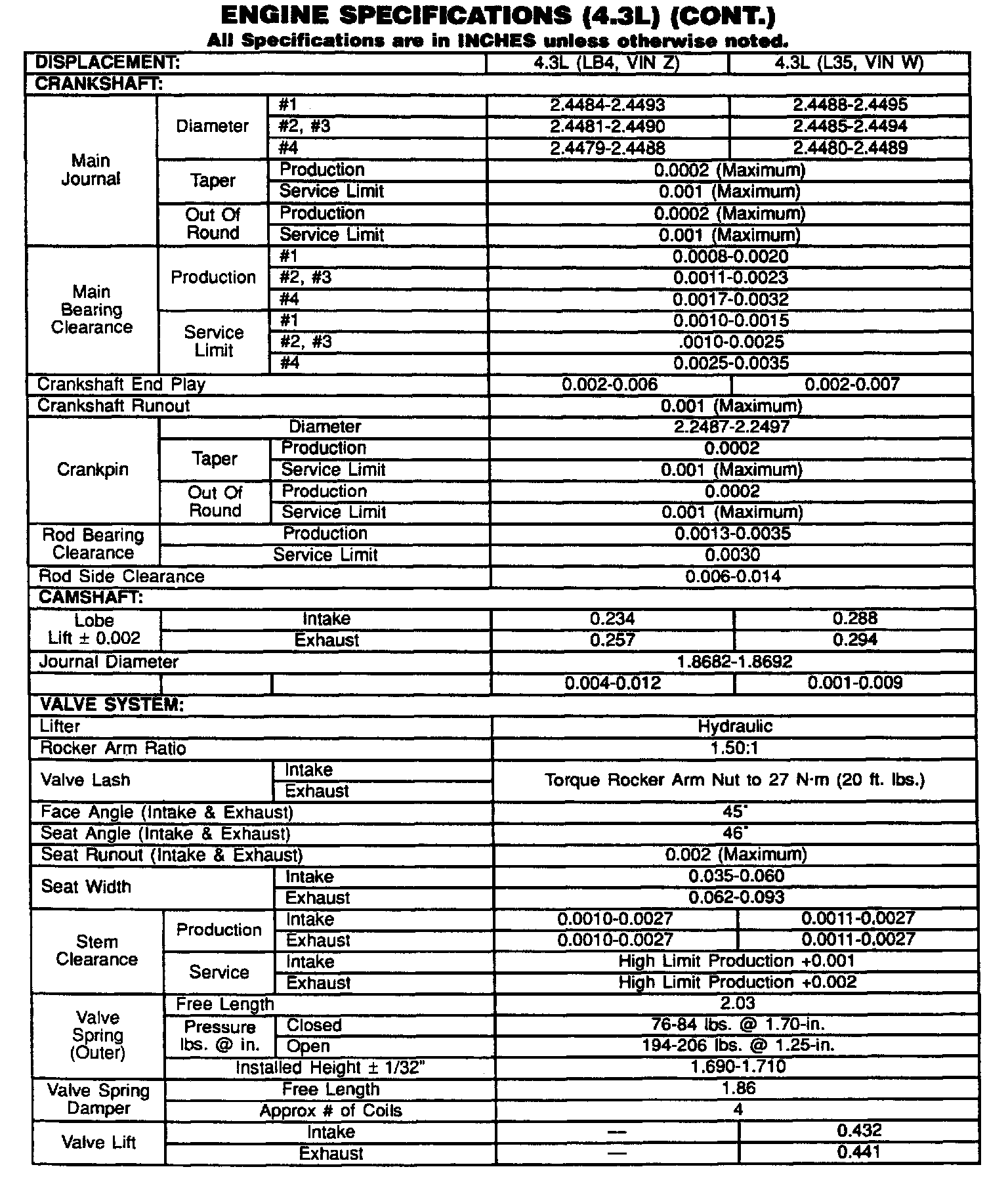 Continued Engine Specifications: