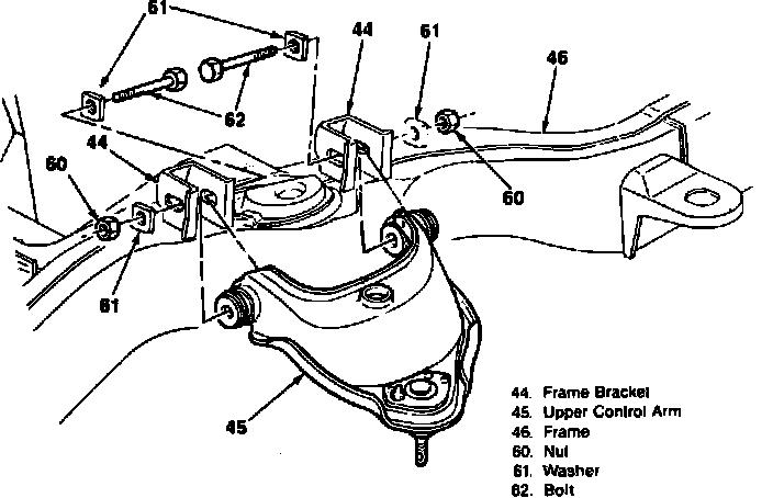 1. Raise and support vehicle and lower control arms, then remove nut (60), washer (61) and bolt (62) from upper control arm bracket (44). Discard nut, washer and bolt.