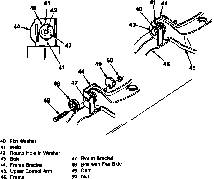 2. Remove large washers (40), Figs. 3 and 4, which are welded to the upper control arm frame brackets.
