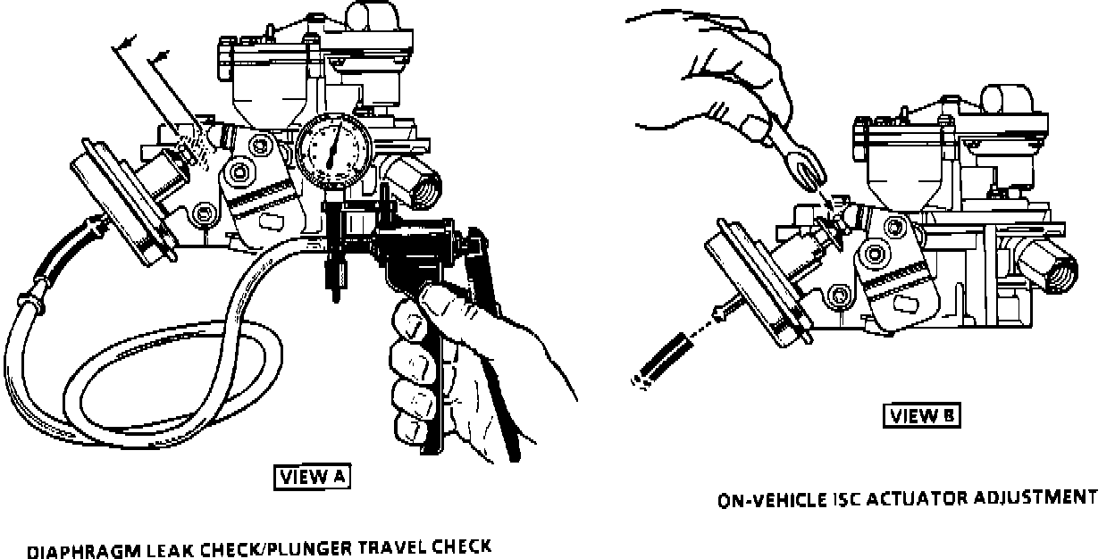 - Before adjusting ISC actuator you must first check the minimum idle speed to be within specifications. Refer to SPECIFICATIONS/IDLE SPEED. (ISC actuator must have vacuum applied so that it is not contacting the throttle lever.) See image VIEW A.