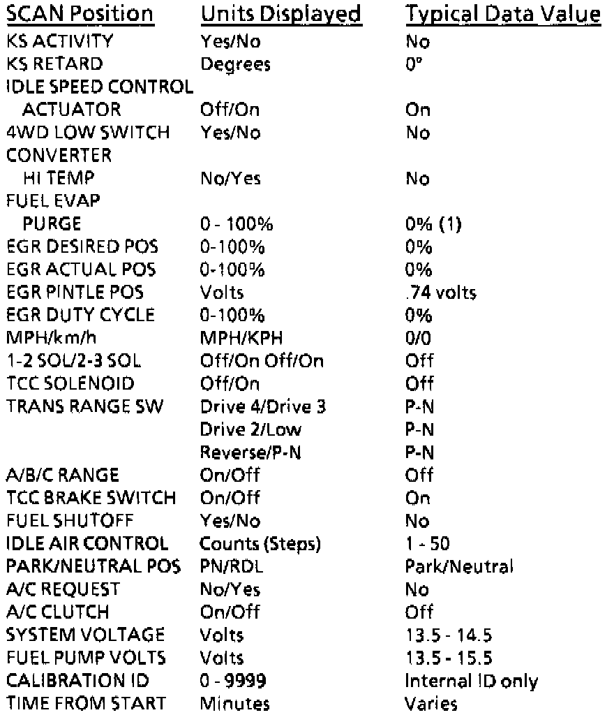 The Tech 1 scan data listed in these tables may be used for comparison after completing the "On-Board Diagnostic (OBD) System Check" and finding the on-board diagnostics functioning properly with no Diagnostic Trouble Codes [DTC(s)] displayed. The "Typical Tech 1 Data Values" are an average of display values recorded from normally operating vehicles and are intended to represent what a normally functioning system would display. The values you get may vary due to low battery charge or other reasons, but they should be very close.A SCAN TOOL THAT DISPLAYS FAULTY DATA SHOULD NOT BE USED, AND THE PROBLEM SHOULD BE REPORTED TO THE MANUFACTURER. THE USE OF A FAULTY SCAN TOOL CAN RESULT IN MISDIAGNOSIS AND UNNECESSARY PARTS REPLACEMENT.