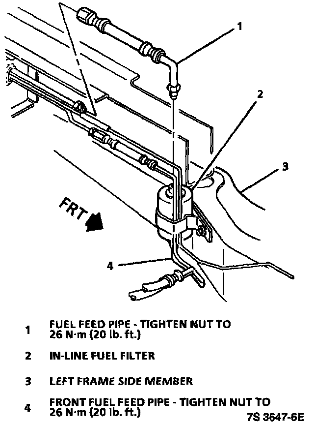 The in-line fuel filter is located in the fuel supply line. On the drivers side of the vehicle forward of the fuel tank