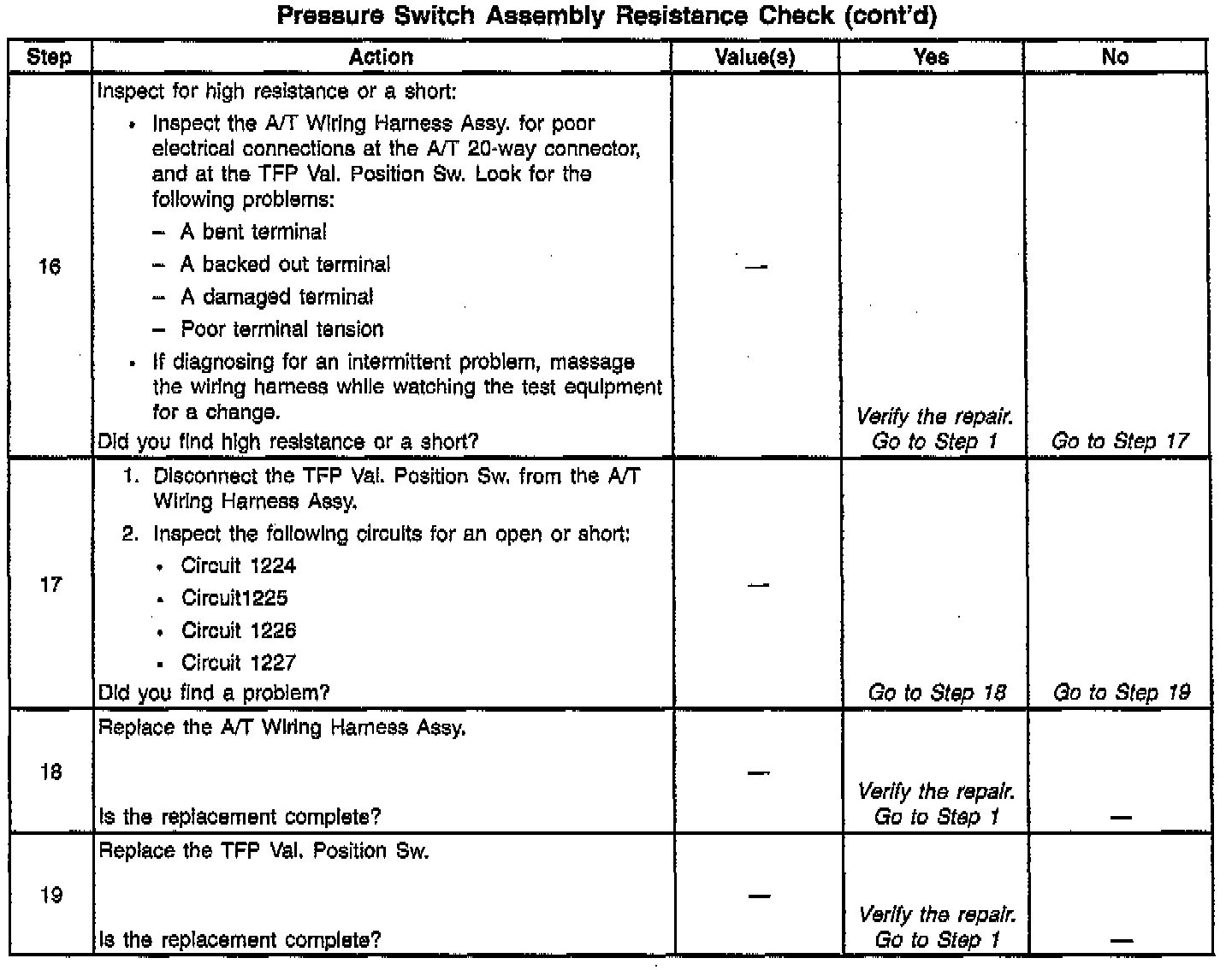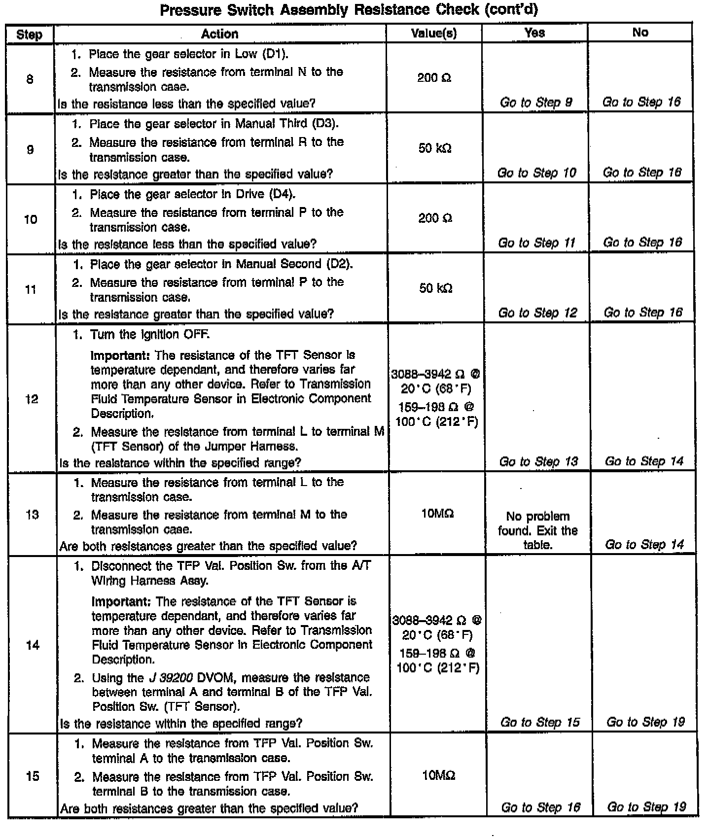 Important: This procedure tests the Automatic Transmission Fluid Pressure Manual Valve Position Switch (TFP Val. Position Sw.) circuits and the Automatic Transmission Fluid Temperature (TFT) Sensor circuit. Do not use this procedure to test other Automatic Transmission circuits, refer to 4L60-E Automatic Transmission Internal Wiring Harness Check.Testing and Inspection