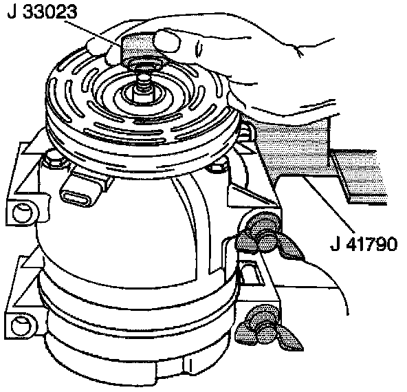 Make sure the clutch coil and the J 33024 stay in-line with each other while pressing the clutch coil onto the compressor.