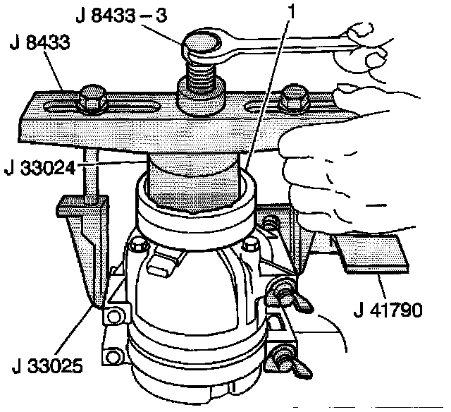 8. Install the J 8433 onto the compressor clutch coil (1) and tighten the puller leg bolts.