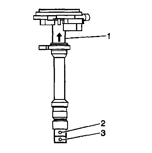2. Align the cast arrow in the distributor housing (1), the driven gear roll pin (2), and the pre-drilled indent hole (3) in the distributor driven gear.