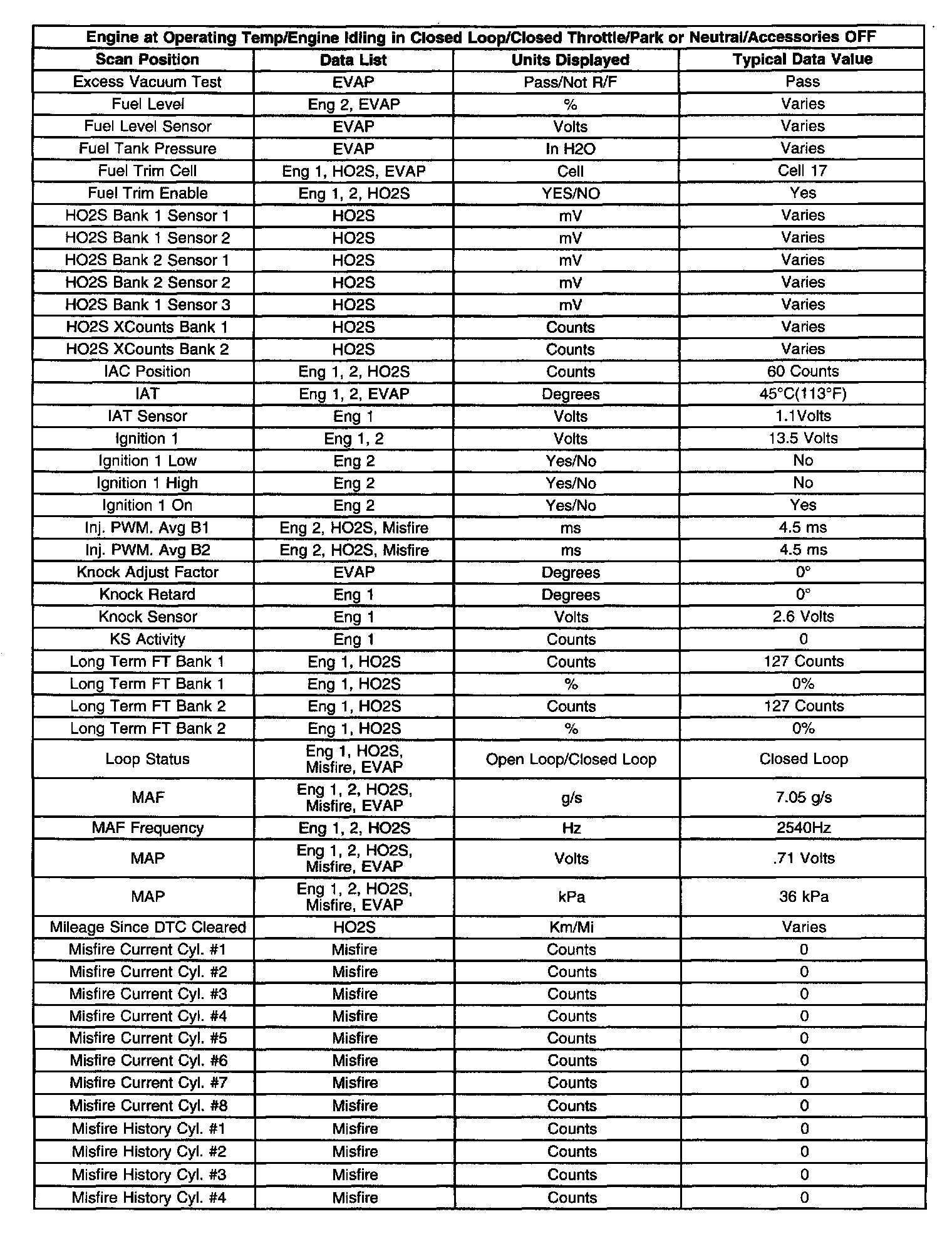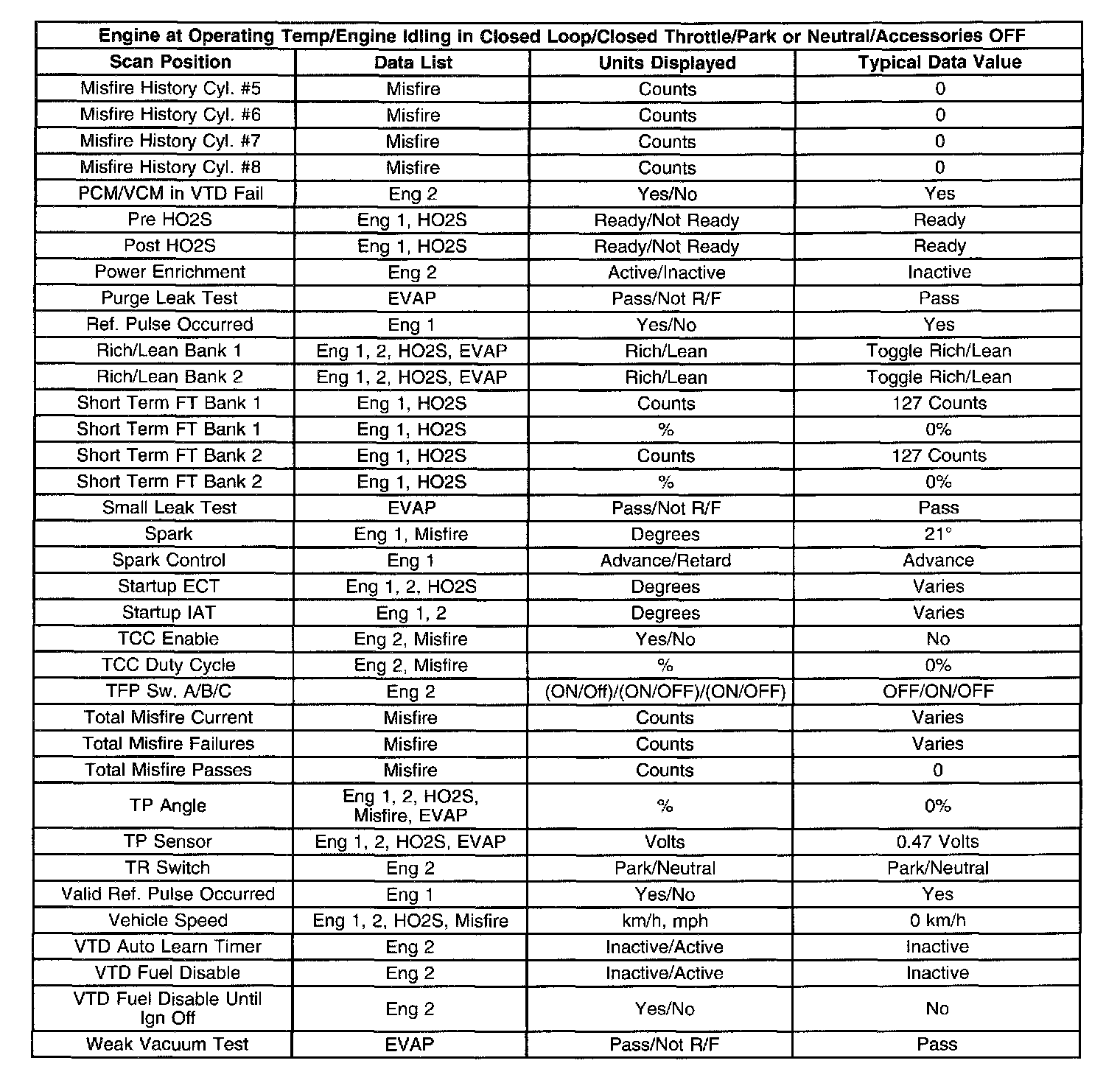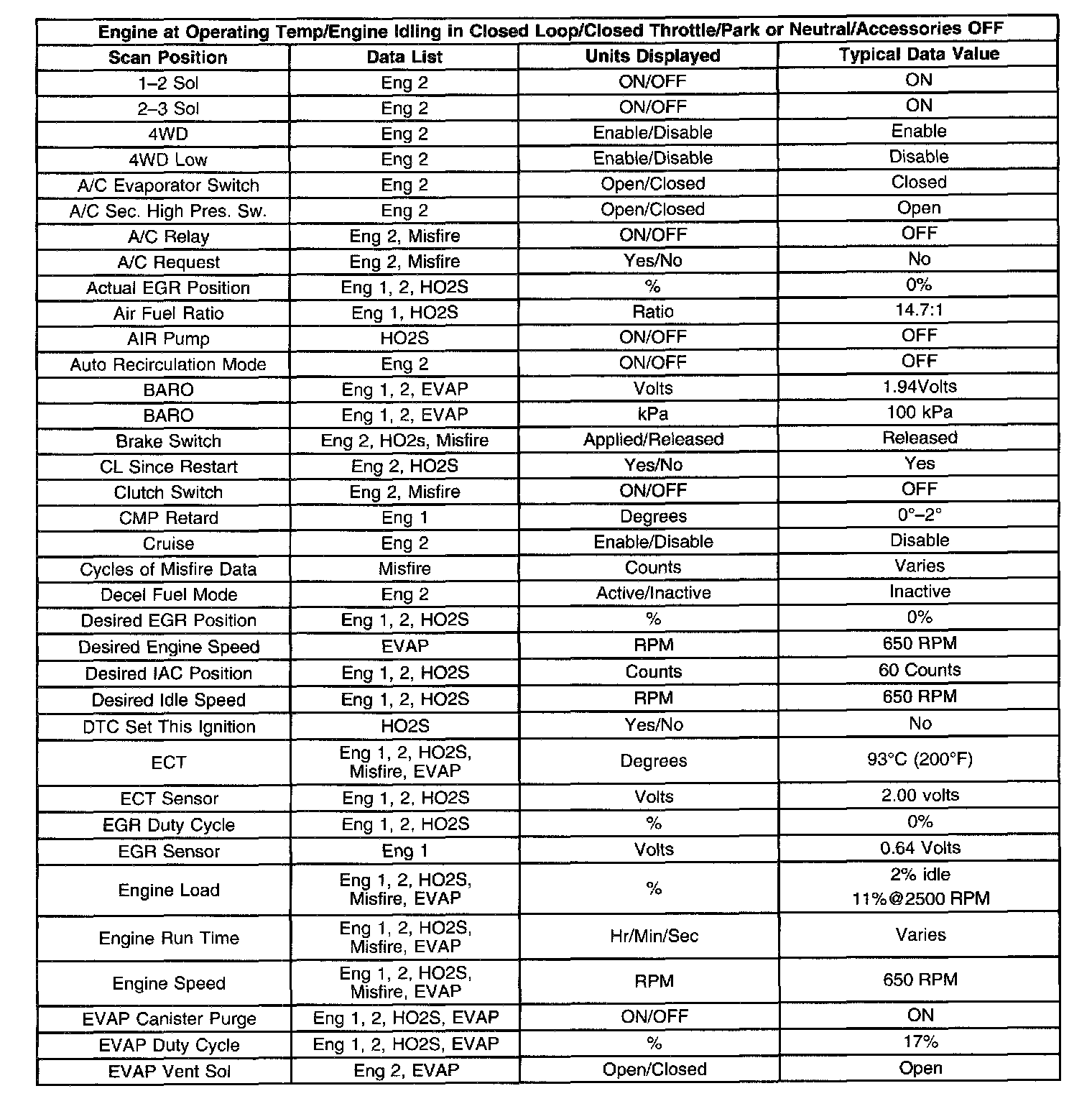 Use the scan tool data listed in this table for comparison after the On-Board Diagnostic system check and finding the on-board diagnostics function properly with no diagnostic codes displayed.