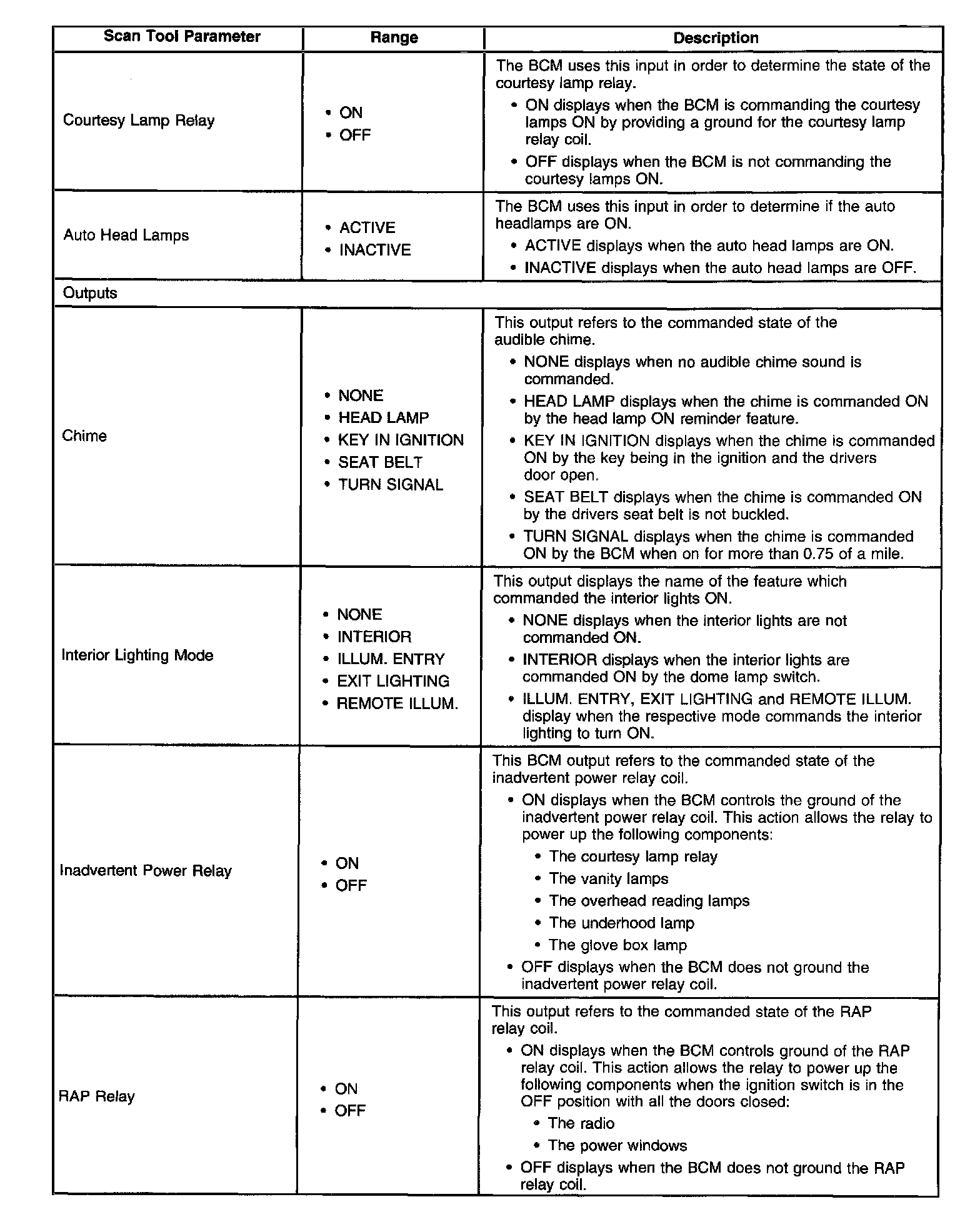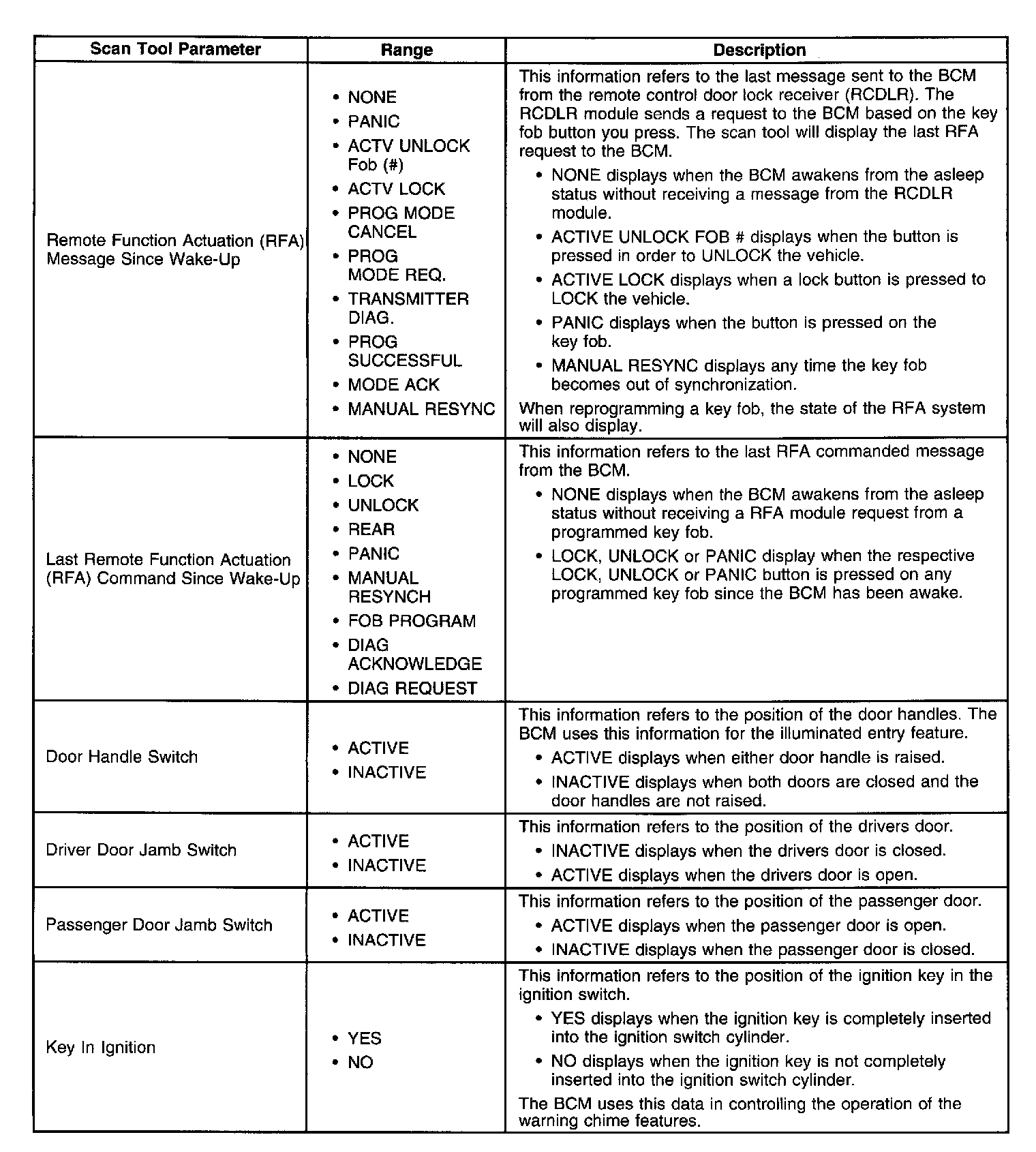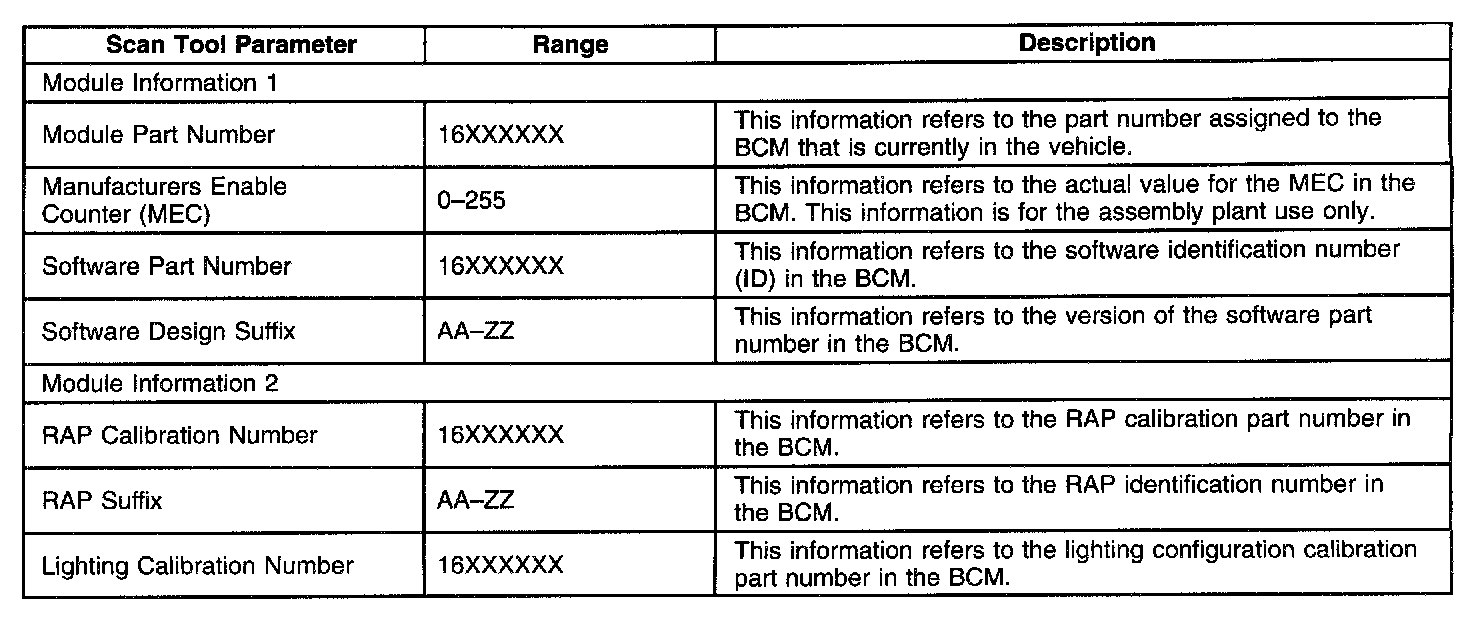 The typical scan tool readings of Body Control Module (BCM) data will assist in diagnosing a problem. You can view the reading while the vehicle is being driven. The Typical Scan Tool Data Definitions represent general information displayed on the scan tool regarding, BCM functions, ignition inputs, and basic operating conditions. The data messages and menu headings displayed on the scan tool are as shown in figures.