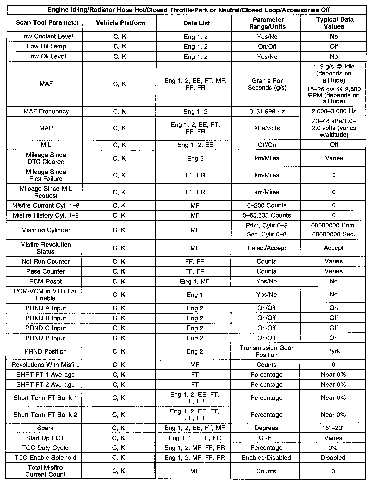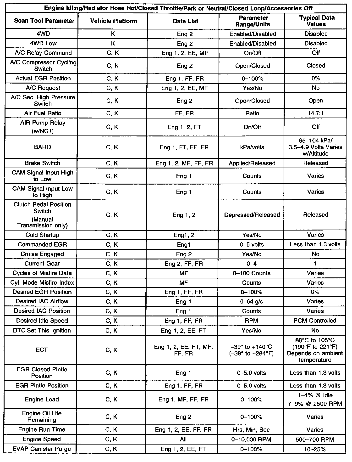 Scan tool values from a properly running engine may be used for comparison with the engine you are diagnosing. The Engine Scan Tool Data List represents values that would be seen on a normal running engine.