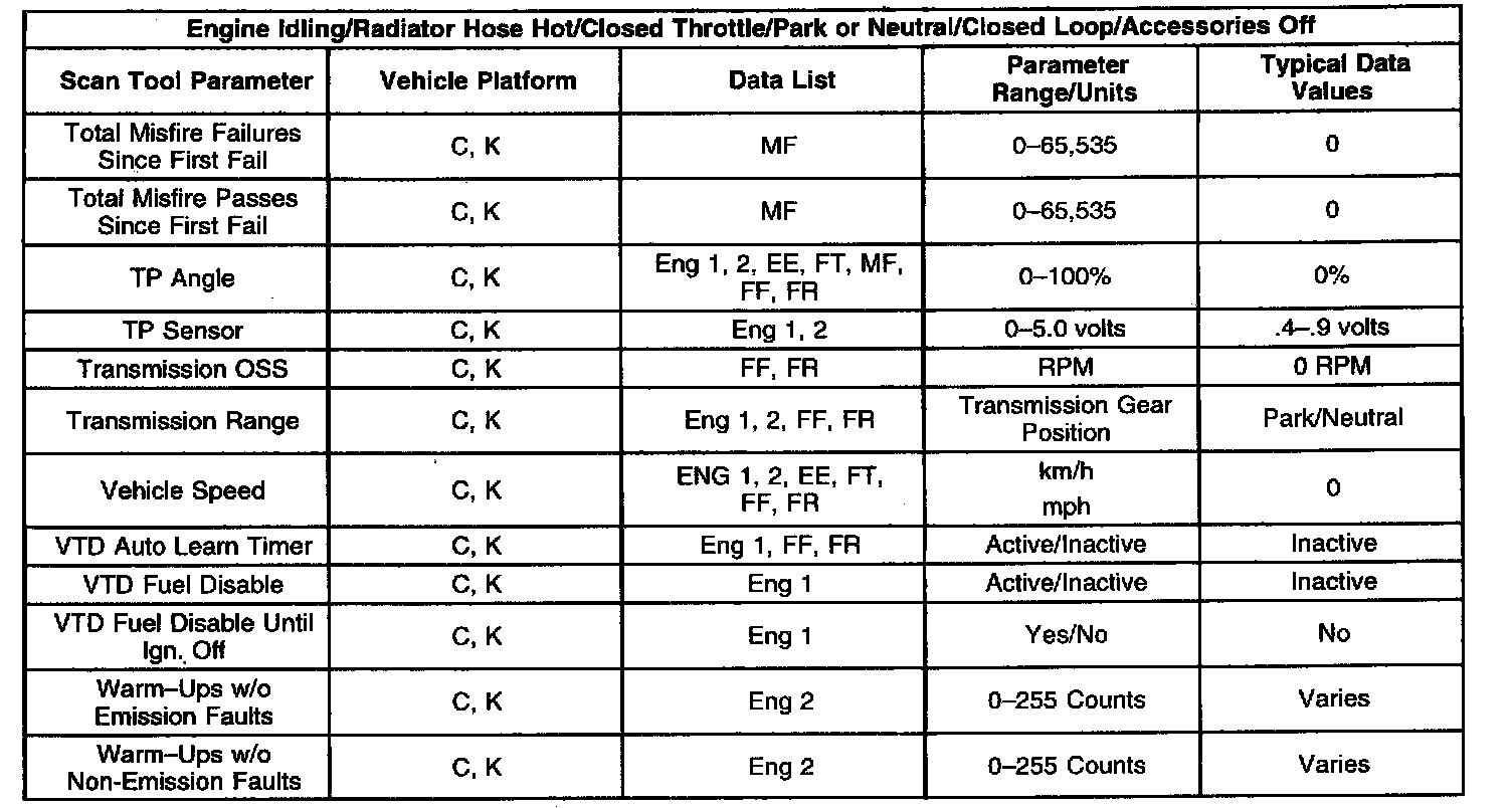 The Engine Scan Tool Data List contains all engine related parameters that are available on the scan tool. The list is arranged in alphabetical order. A given parameter may appear in any one of the data lists, and in some cases may appear more than once, or in more than one data list in order to group certain related parameters together.