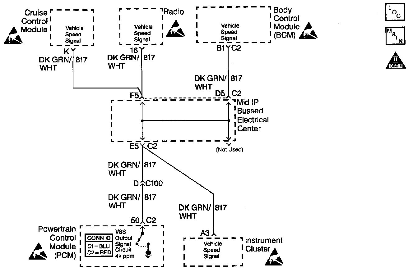 Various components apply a voltage to the vehicle speed output circuit. The Powertrain Control Module (PCM) creates the vehicle speed output signal by rapidly grounding this circuit via an internal switch called a driver. The driver operates at the same rate as the Vehicle Speed Sensor (VSS) signal input. The various components recognize the voltage being pulled to ground as an indication of vehicle speed.