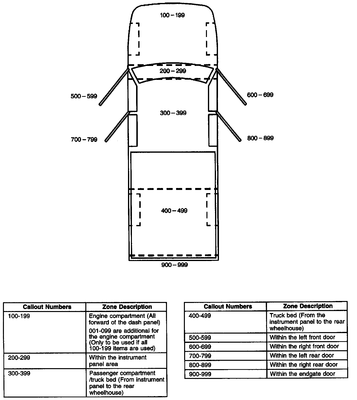 All grounds, in-line connectors, pass-through grommets, and splices have identifying numbers that corresponds to where they are located in the vehicle. The following table explains the numbering system.