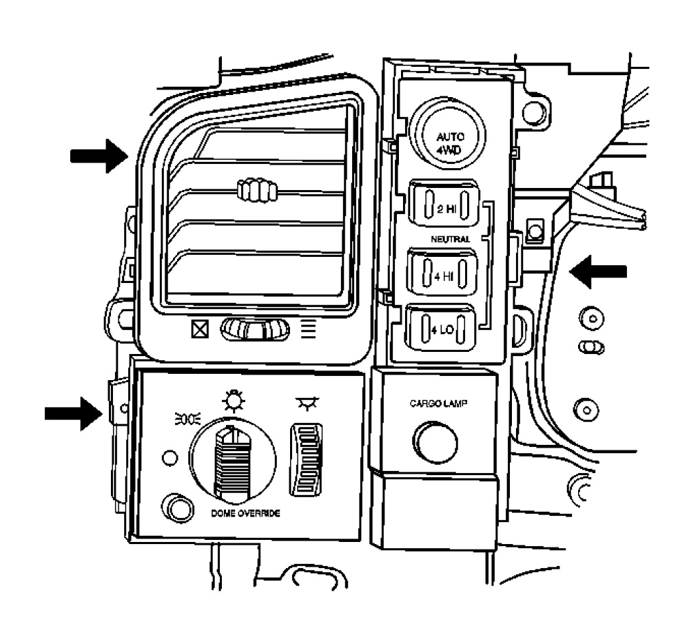 4. Remove the lamp switch, 4WD shift buttons, cargo lamp and air deflector louver assembly from the vehicle.