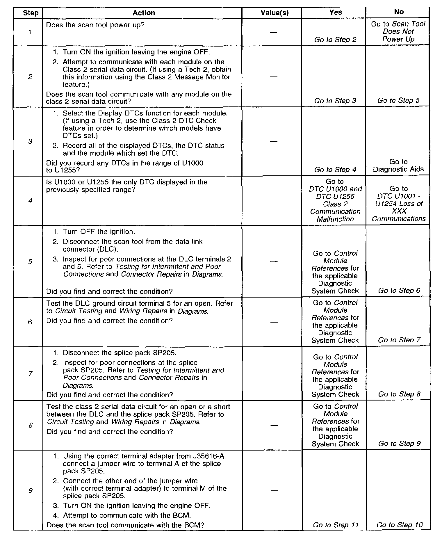 8. An open in the class 2 serial data circuit between the DLC and splice pack SP 205 will prevent the scan tool from communicating with any module. This condition will not set a DTC.