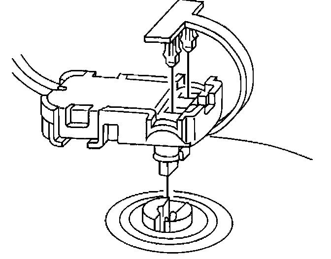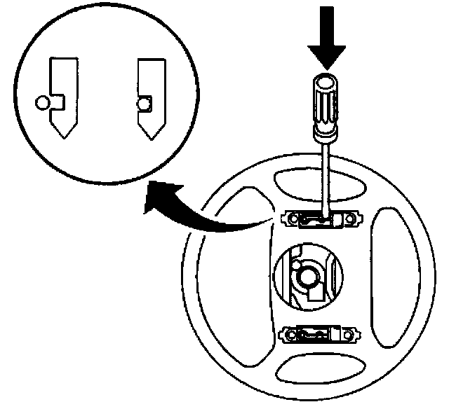 5. Press the inflator module into the steering wheel firmly enough that the module engages and latches the notched pins in the leaf springs.