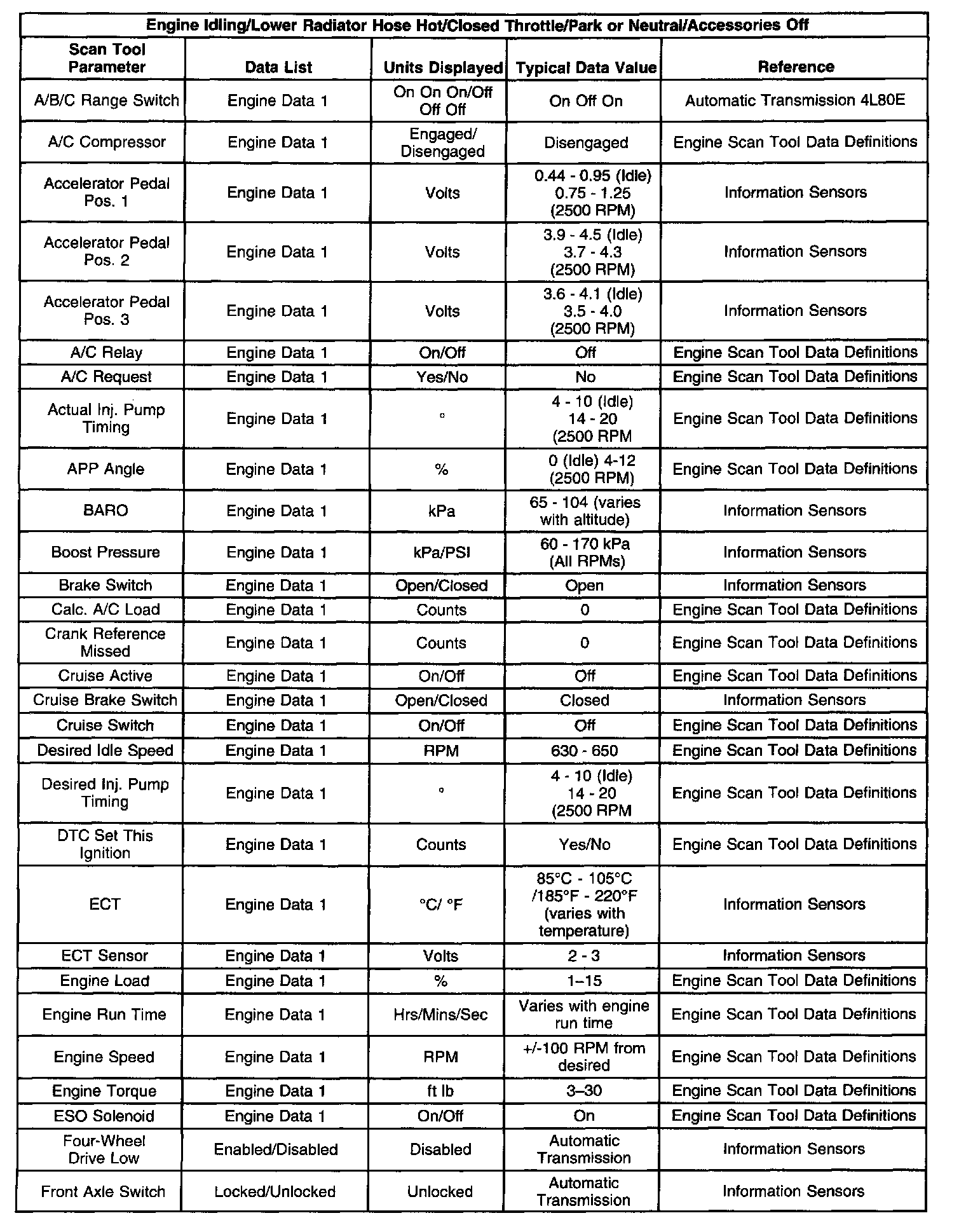 Use only the parameters listed in the tables for diagnosis. If a scan tool reads other parameters, the values are not recommended by General Motors for use in diagnosis. For more description on the values and the use of the scan tool diagnosis the PCM inputs, refer to the applicable diagnosis. If all values are within the range illustrated, refer to Driveability Symptoms.