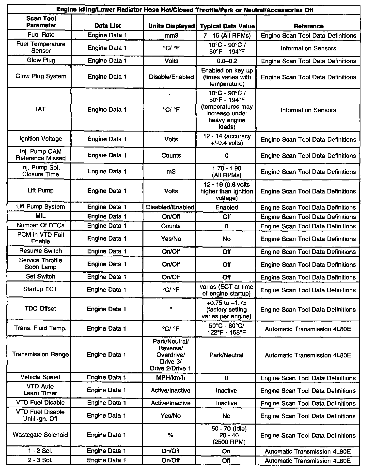 Use the scan tool data listed in this table for comparison after the On-Board Diagnostic system check and finding the on-board diagnostics function properly with no diagnostic codes displayed.