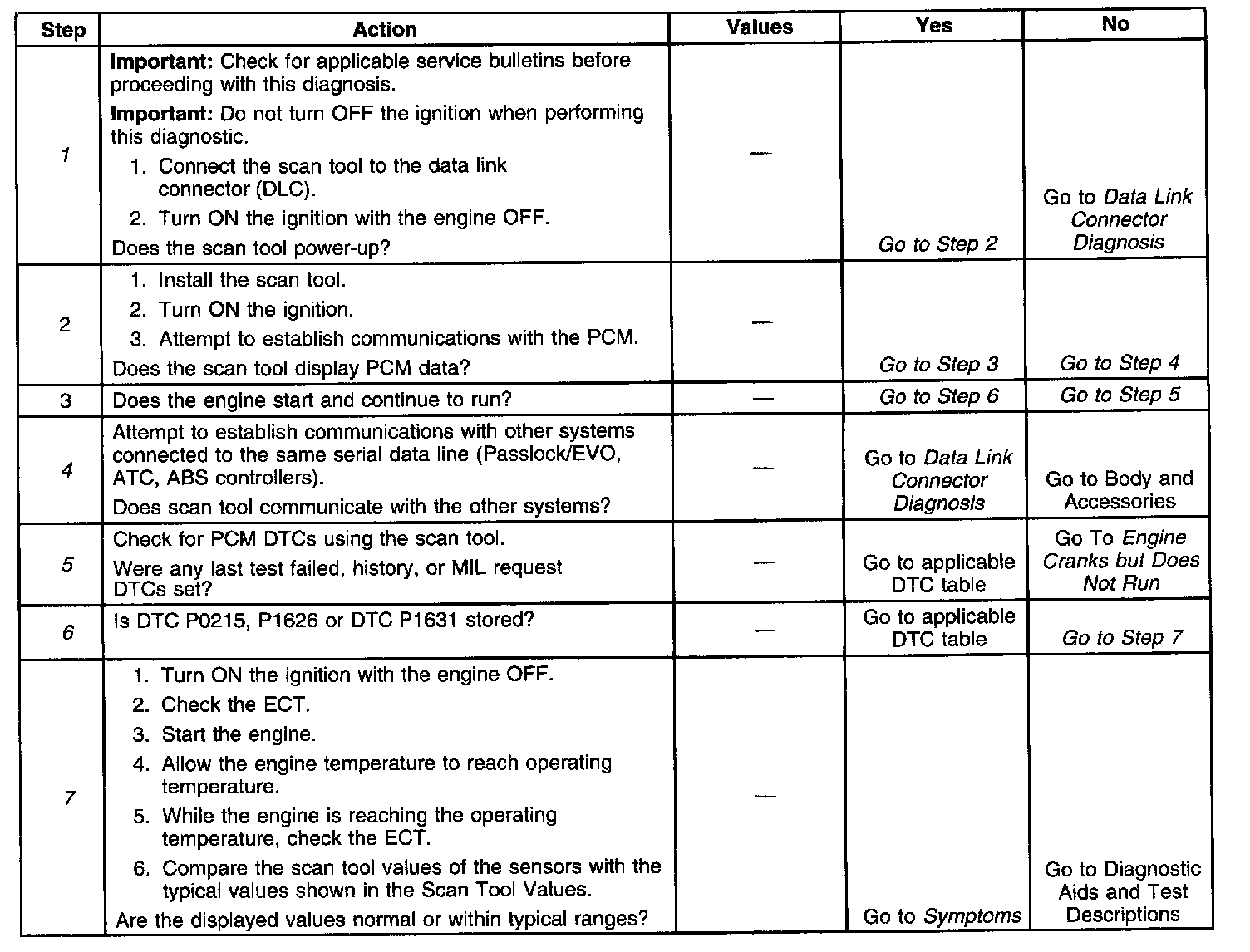 The Powertrain On-Board Diagnostic (OBD) System Check is an organized approach in identifying a problem created by an electronic engine system fault. The OBD system check is the starting point for any driveability diagnosis. The OBD system check directs the service technician to the next step in diagnosing the complaint. Do not perform this check if no driveability complaint exists. Understanding the table correctly reduces the diagnostic time. Understanding the table correctly prevents the replacement of good parts.