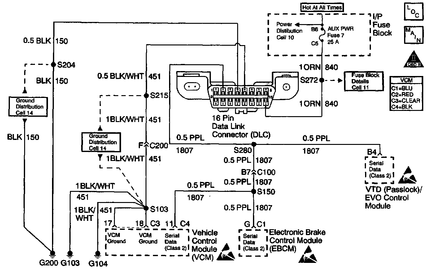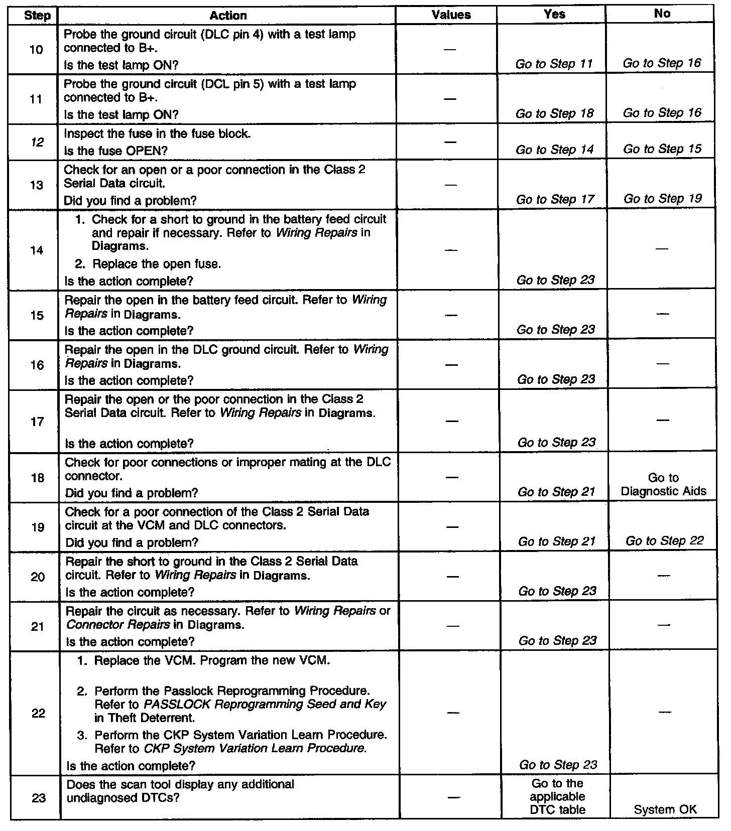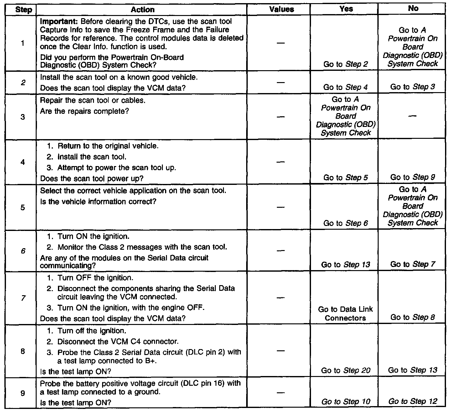 The Class 2 Serial Data circuit to the DLC allows bi-directional communication between the VCM and the scan tool. This is accomplished through pin 2 of the DLC. If the communication between the scan tool and the VCM cannot be established, use the procedure in the DLC diagnosis table in order to diagnose the condition.