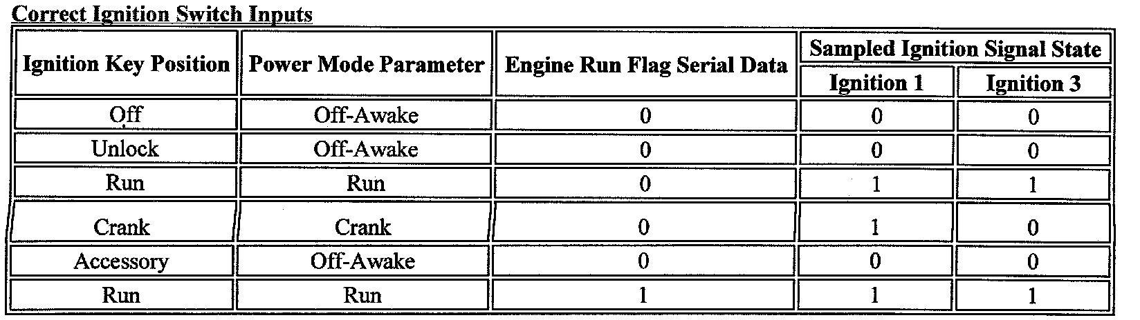 Those modules that have discrete ignition signal inputs also remain in the state dictated by the last valid BCM message received on the serial data circuits. They then check the state of their discrete ignition input to determine the current valid state. If the discrete ignition input is active, B+, the modules will fail-safe to the "RUN" power mode. If the discrete ignition input is not active, open or 0 voltage, the modules will fail-safe to "OFF-AWAKE". In this state the modules are constantly checking for a change status message on the serial data circuits and can respond to both local inputs and serial data inputs from other modules on the vehicle.