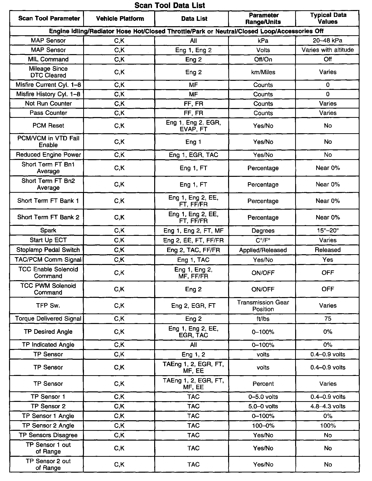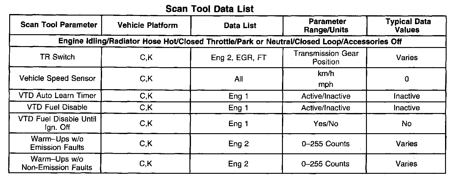 The Engine Scan Tool Data List contains all engine related parameters that are available on the scan tool. The list is arranged in alphabetical order. A given parameter may appear in any one of the data lists, and in some cases may appear more than once, or in more than one data list in order to group certain related parameters together.