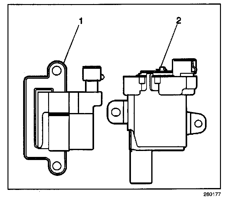 ^ There are 2 different manufacturers for the ignition coils, the Melco(R) (1) (square design), and the Delphi(R) (2) (round design). These 2 coils use 2 different spark plug wire, and mounting brackets.