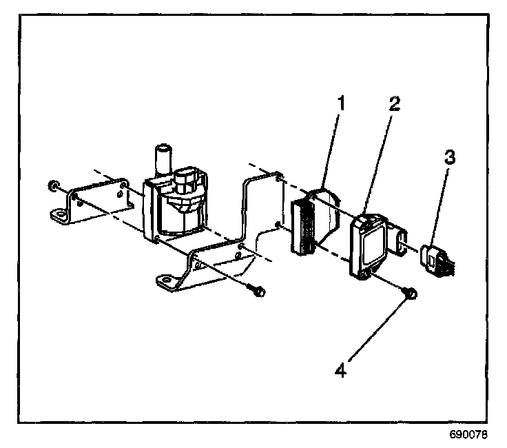 3. Remove the screws (4) holding the ignition control module (2) and the heat sink (1) to the bracket.
