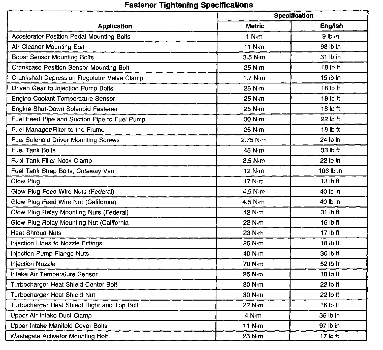 Fastener Tightening Specifications: