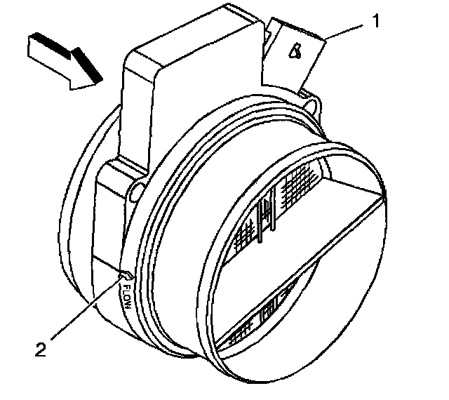 If the mass air flow (MAF) sensor is installed backwards, the system will go rich. An arrow (2) cast into the plastic portion of the sensor indicates proper air flow direction. The arrow must point toward the engine.