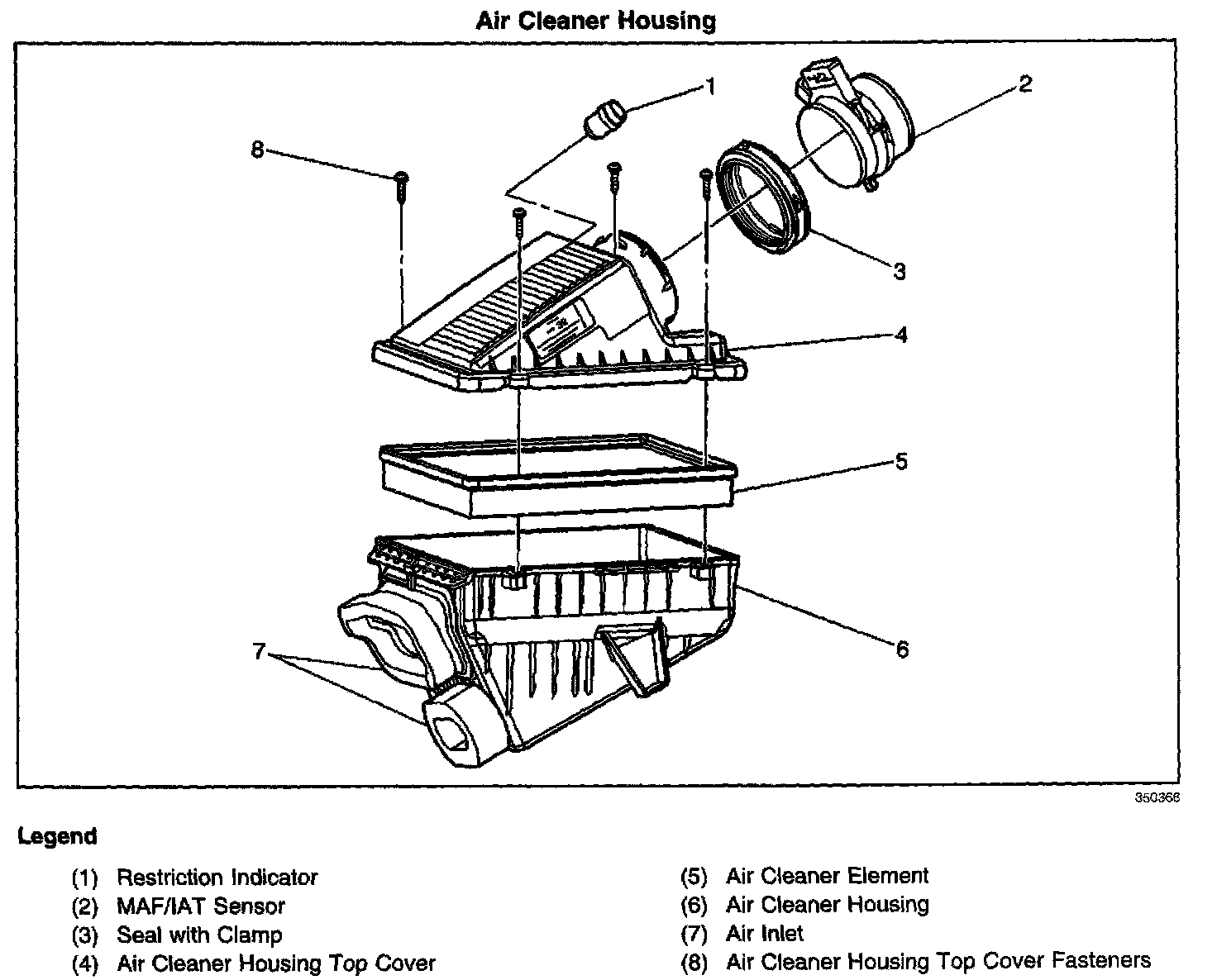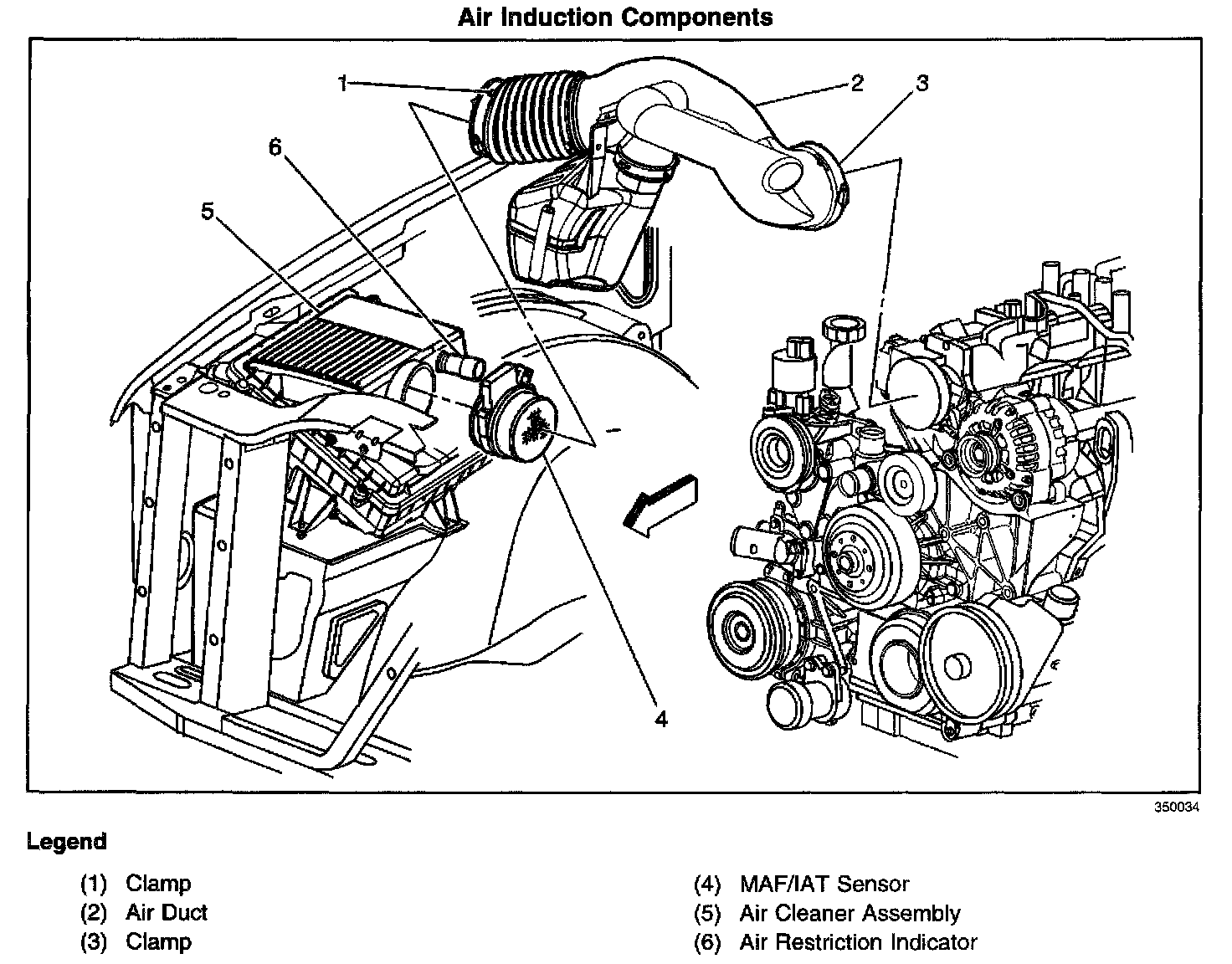The air cleaner assembly is remotely mounted. The air intake system draws outside air through the side of the air cleaner assembly and filter element of the forward mounted air cleaner. The air is then routed through the Mass Air Flow (MAF) sensor and then into the throttle body to the intake manifold. The air is then directed into the intake manifold runners, through the cylinder heads and into the cylinders.