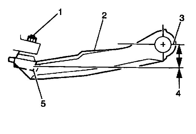 5. Measure from the pivot bolt center line (3) down to the lower corner (5) of the lower ball joint (1) in order to obtain the Z height measurement (4).