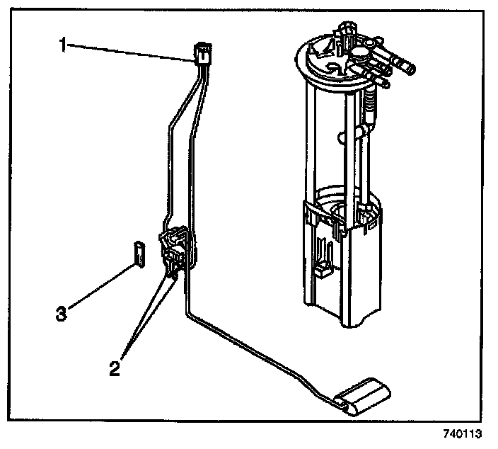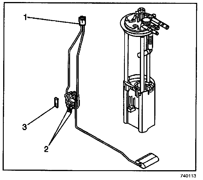 4. Squeeze the locking tangs (2) and remove the fuel level sensor.