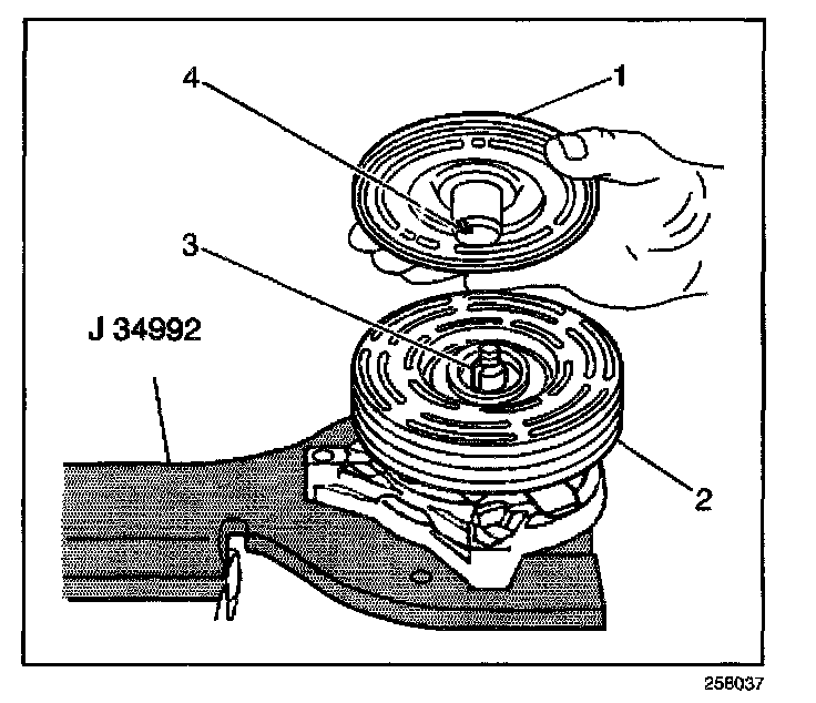 4. Place the clutch plate and the hub assembly (1) onto the compressor shaft.