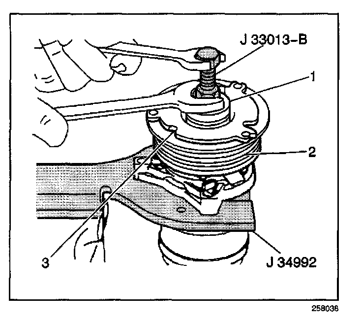 8. Back off the body of the J 33013-B as necessary in order to permit the center screw to be threaded onto the end of the compressor shaft.