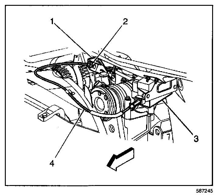 1. Route the cruise control cable (4) from the cruise control module (3) to the throttle body.