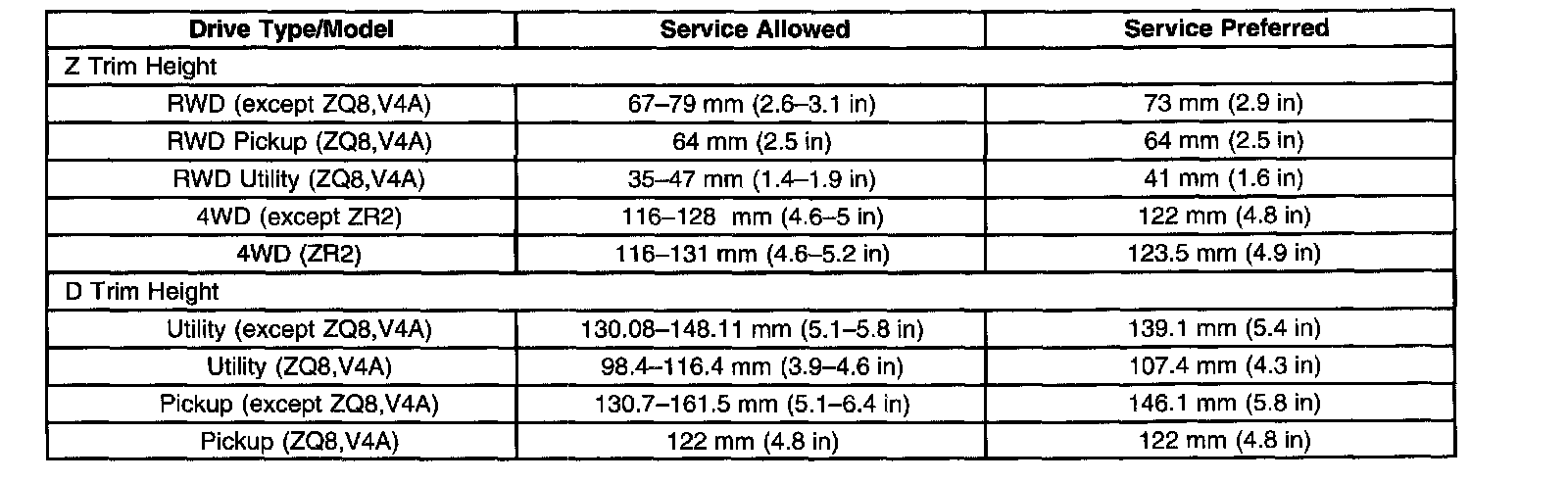 Ride/Trim Height Specifications