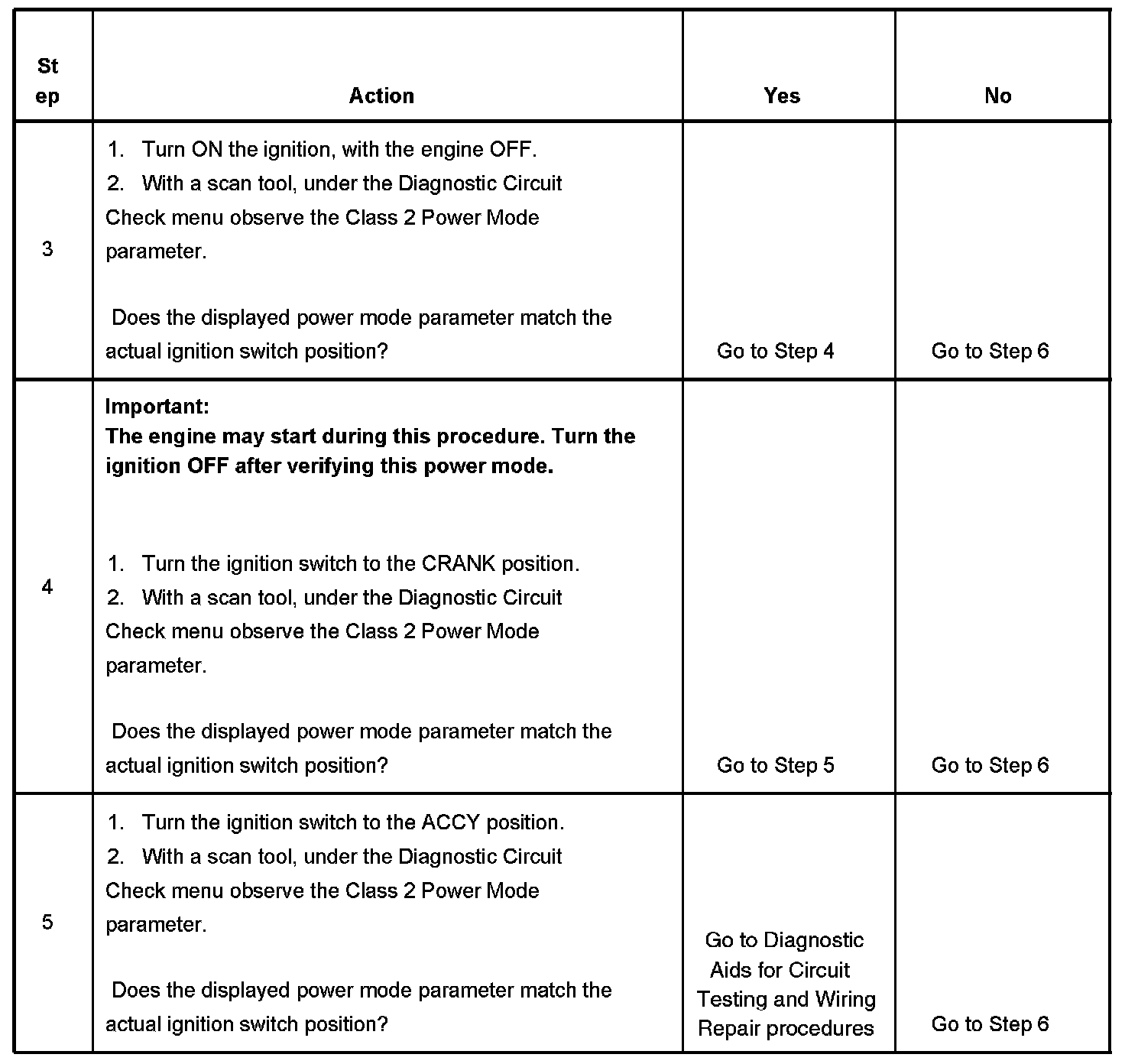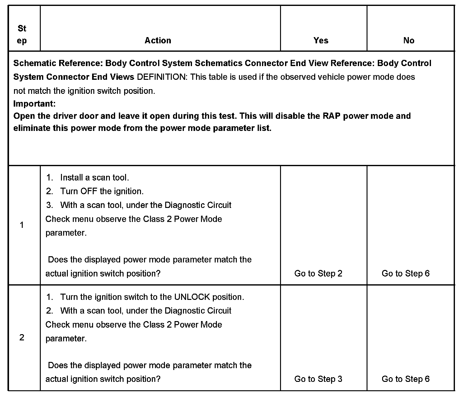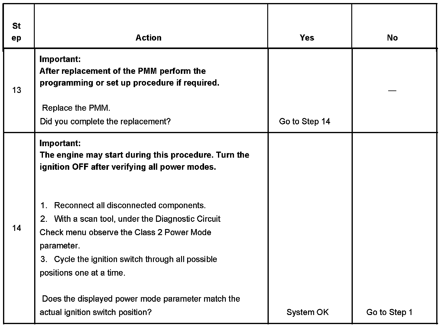 Normal vehicle class 2 communications and module operations will not begin until the system power mode has been identified. Discrete wires from the ignition switch contacts are monitored by the power mode master (PMM) module in order to determine the correct power mode. The PMM communicates the system power mode to all class 2 modules on the class 2 serial data line. Refer to Body Control System Description and Operation to identify which module is the PMM and the applicable power mode look up table.