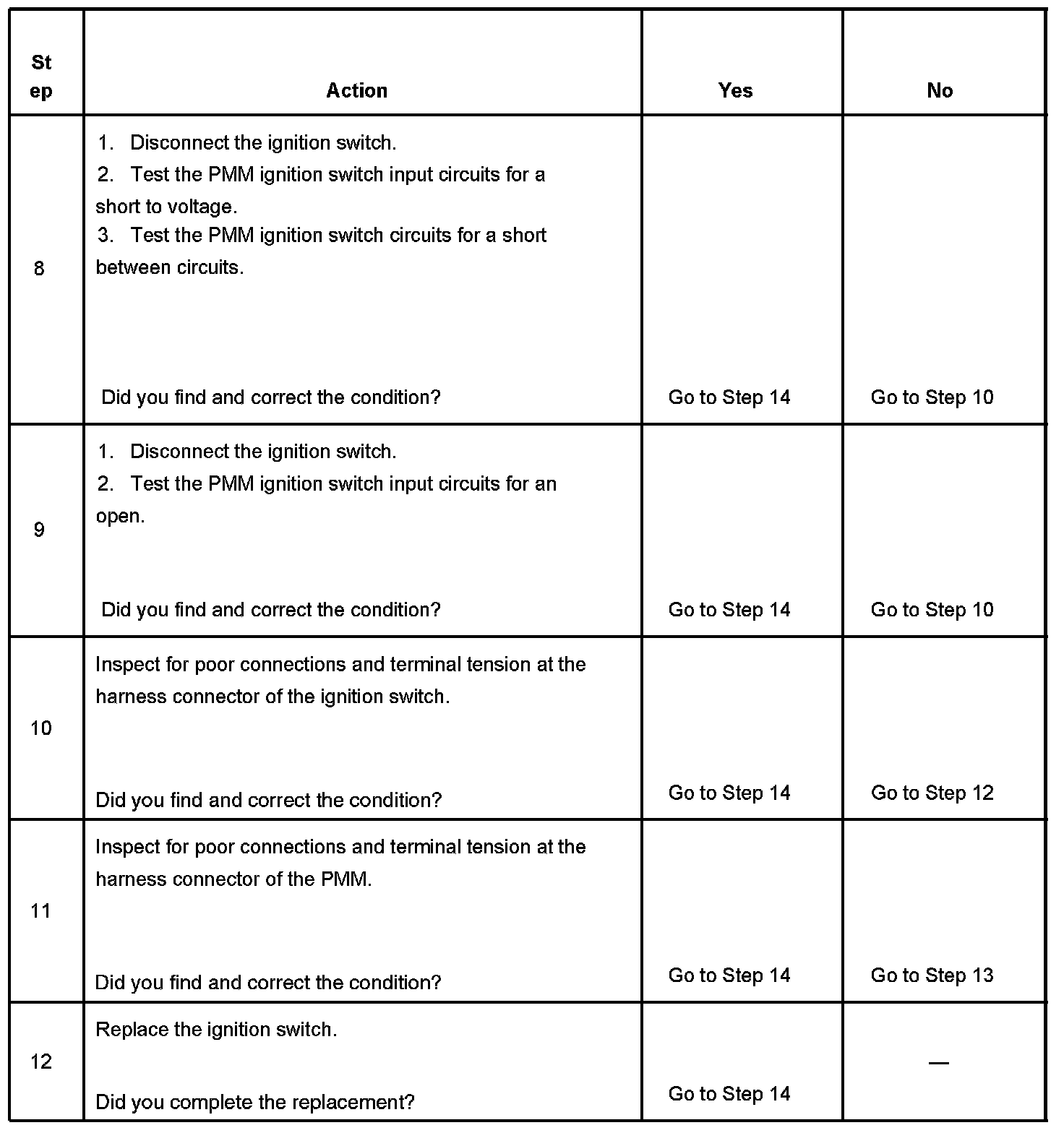 8. If any ignition switch parameters that should be inactive in the present ignition switch position are active, 2 ignition switch signal circuits may be shorted together.