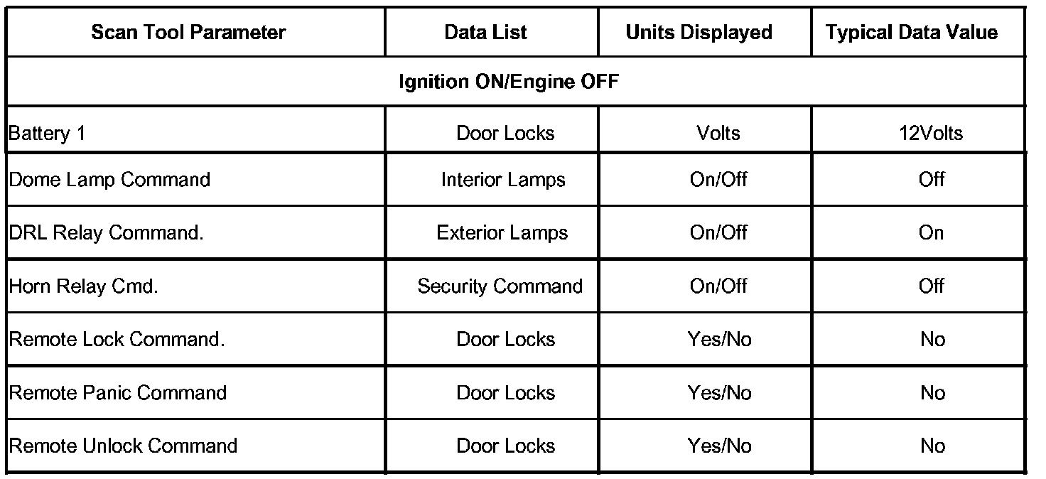 The Keyless Entry Scan Tool Data List contains all of the keyless entry related parameters that are available on the scan tool. The parameters in the list are arranged in alphabetical order. The column, "Data List," indicates the location of the parameter within the scan tool menu selections. Use the Keyless Entry Scan Tool Data List as directed by a diagnostic table or in order to supplement the diagnostic procedures. Begin all of the diagnostic procedures with Diagnostic System Check - Remote Keyless Entry.